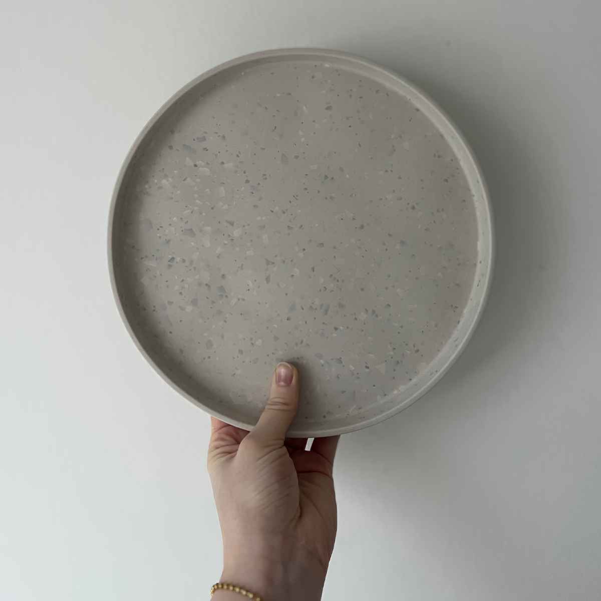 Das Tablett hat einen Durchmesser von 25 cm und einen 2 cm hohen Rand.